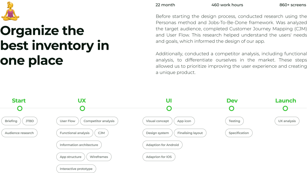 Before the Product Design I clarify: Defining project goals and scope, Evaluating existing solutions, User needs and preferences, identify potential usability issues and areas for improvement in the existing product or system, — to ensures the end product meets user needs effectively.
